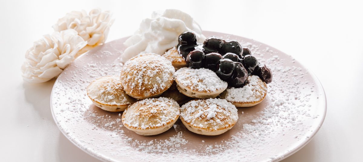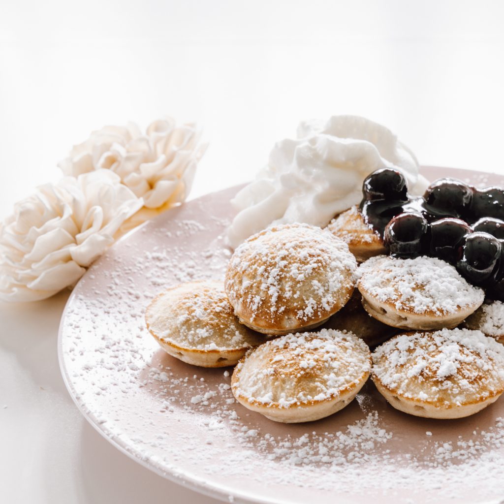 Golden poffertjes topped with maple syrup, sweet blueberry compote and, a swirl of whipped cream â simple, fresh, and full of flavor.