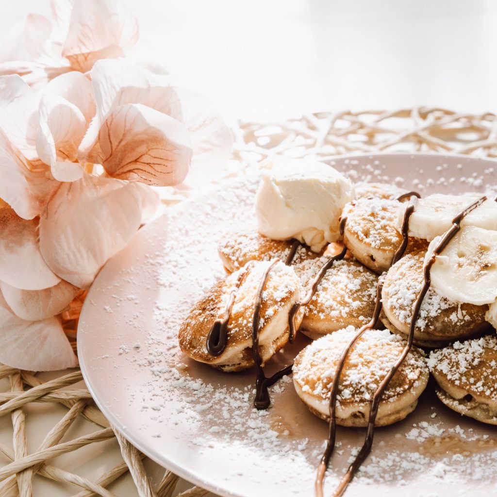 Fluffy poffertjes paired with banana, Nutella, maple syrup, and a touch of powdered sugar – warm, sweet, and full of joy.
