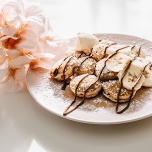 Fluffy poffertjes paired with banana, Nutella, maple syrup, and a touch of powdered sugar – warm, sweet, and full of joy.